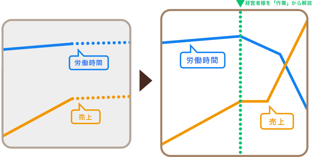 これが「労働時間」が削減すると「売上」が上がる仕組みです。