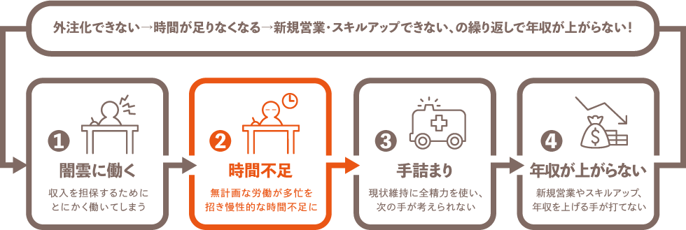 経営者様が両方を抱えている場合は、労働時間の半分以上が「誰でもできる作業」に費やされることもあり、本来専念しなければいけない「付加価値を生む仕事」に時間をかけられず質の低下にもつながってしまいます。